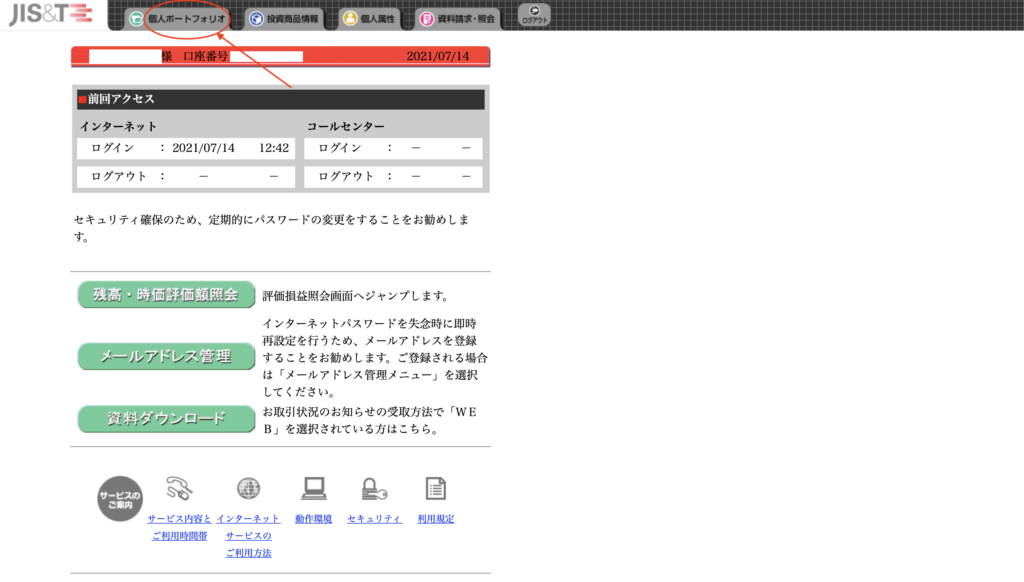 ログイン画面でJIS&T口座番号とインターネットパスワードを入力します。