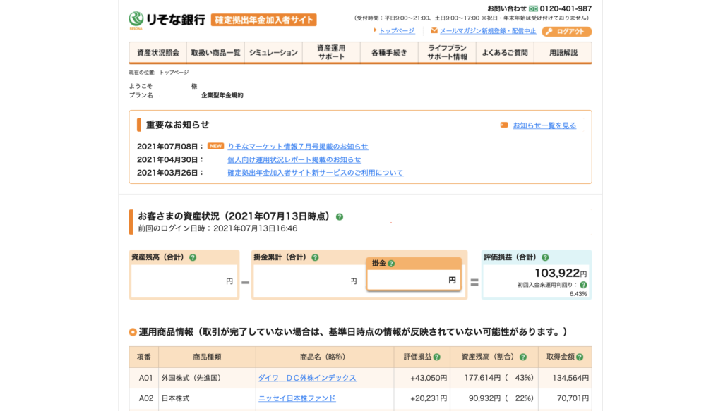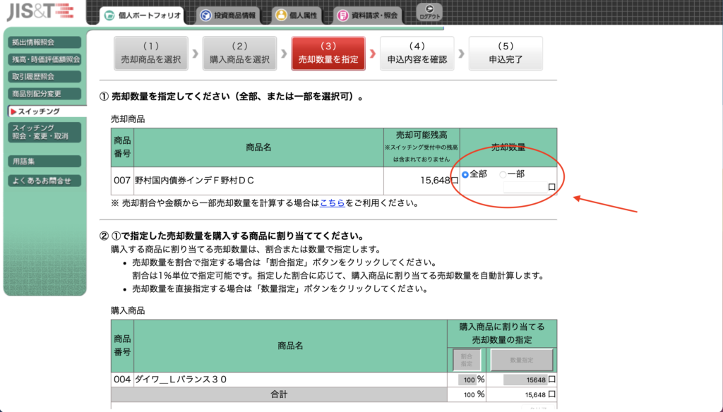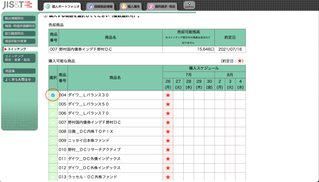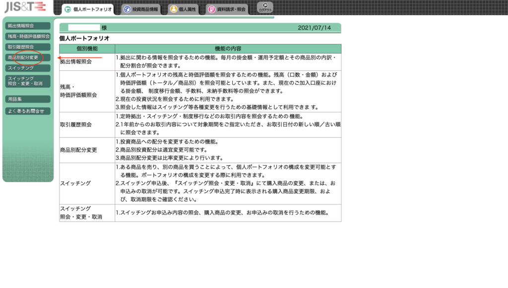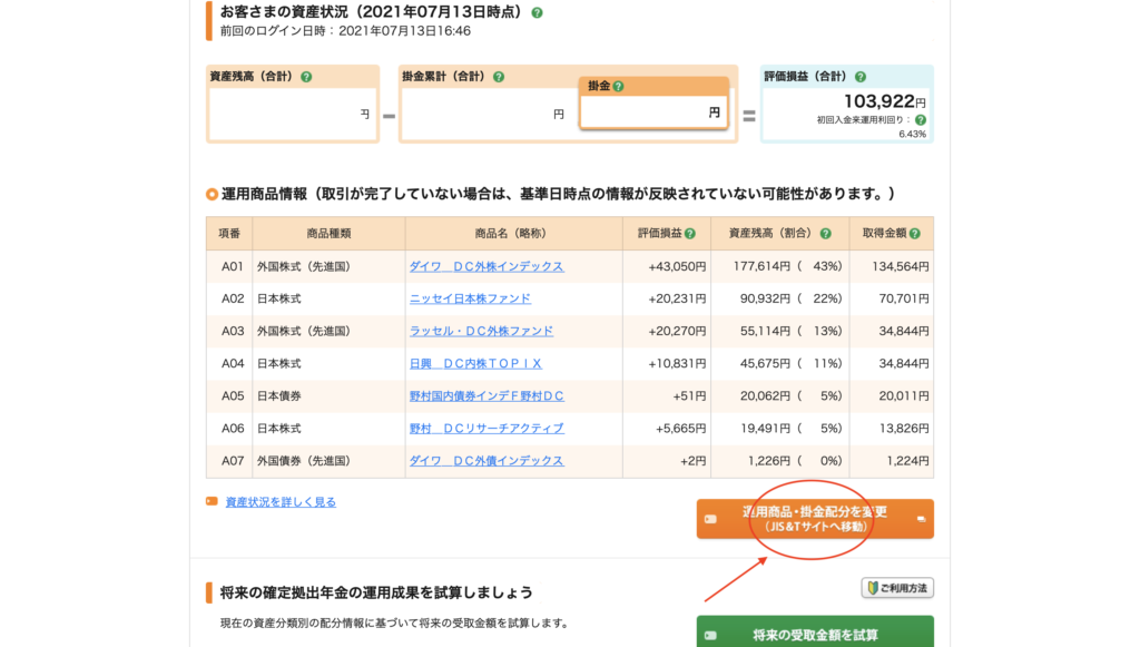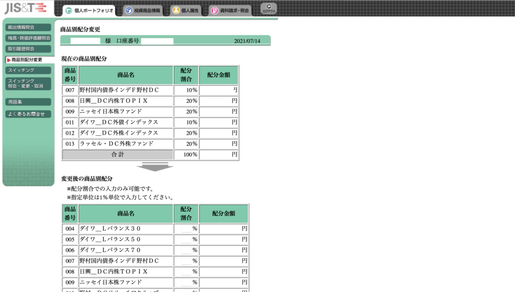 ここに自分の運用したい商品と掛金の割合を入力します。